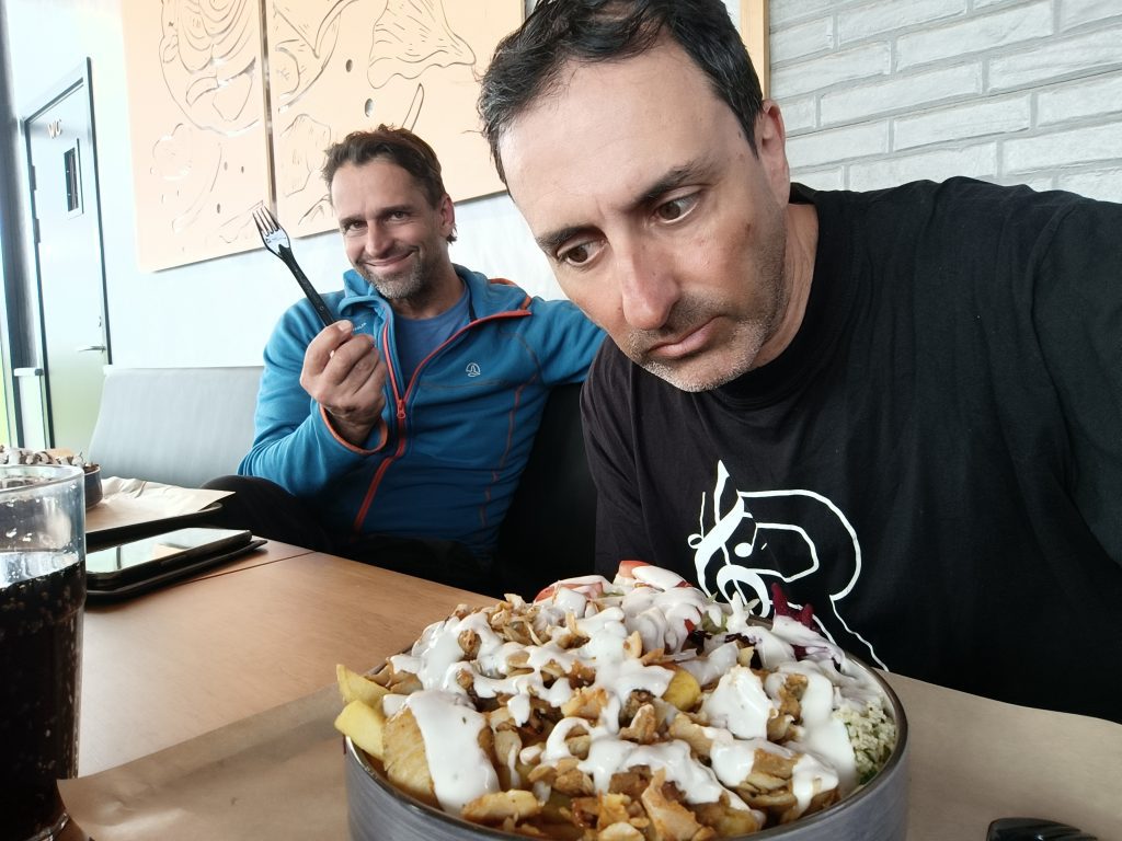 Como llegamos temprano, quisimos aprovechar para poner lavadora y secadora. El letrero ponía que funcionaban con monedas de 20 céntimos de euro, y como teníamos unas cuantas, comenzamos con el lavado… Pero claro, había que ir echando monedas como en las antiguas cabinas telefónicas… cada par de minutos. Cuando se nos gastaron las monedas, la lavadora, simplemente, pausó el lavado ¡y se quedó cerrada! Y ahí estaba yo, paseando en una tarde lluviosa por un camping cual mendigo pidiendo monedas… Monedas que, por otra parte, nadie te daba, porque ellos mismos las guardaban para poner la lavadora/secadora. Tras un buen rato, conseguí algunas y logramos terminar el lavado (Otras personas que estaban junto a nosotros no tuvieron tanta suerte). Moraleja, ¡¡lleva monedas de 20 céntimos!! Además, no era la primera vez que nos hicieron falta. También las usamos en algunas duchas, para el agua caliente, al subir.